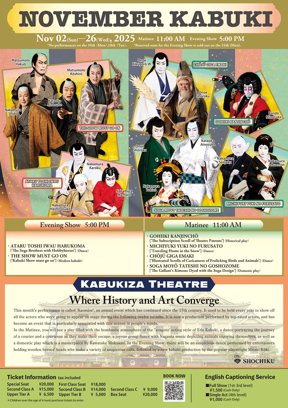 - 【🔗How to buy tickets】Shochiku Multilingual Online Ticket serves as a ticket agency, meaning you can only purchase tickets allocated to it. This service becomes unavailable two days before the performance date, at which point a "Sold Out" message will appear. However, tickets may still be available from the promoter, Shochiku Co., Ltd. for dates that are shown as "sold out". To check availability and other preferred seating areas, please call +81(0)3 6745-0888 or visit the box office.